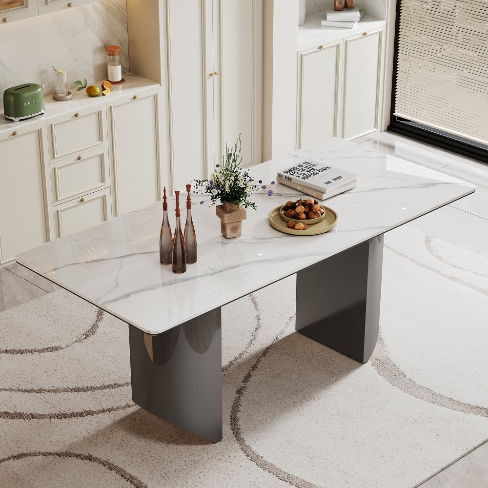 Aesthetic Appeal: The finish adds a touch of sophistication to the overall design, complementing the natural beauty of the sintered stone composite and tempered glass surface.0.47" Thick Sintered Stone Composite Tempered Glass Top Dining Table with Stainless Steel Base