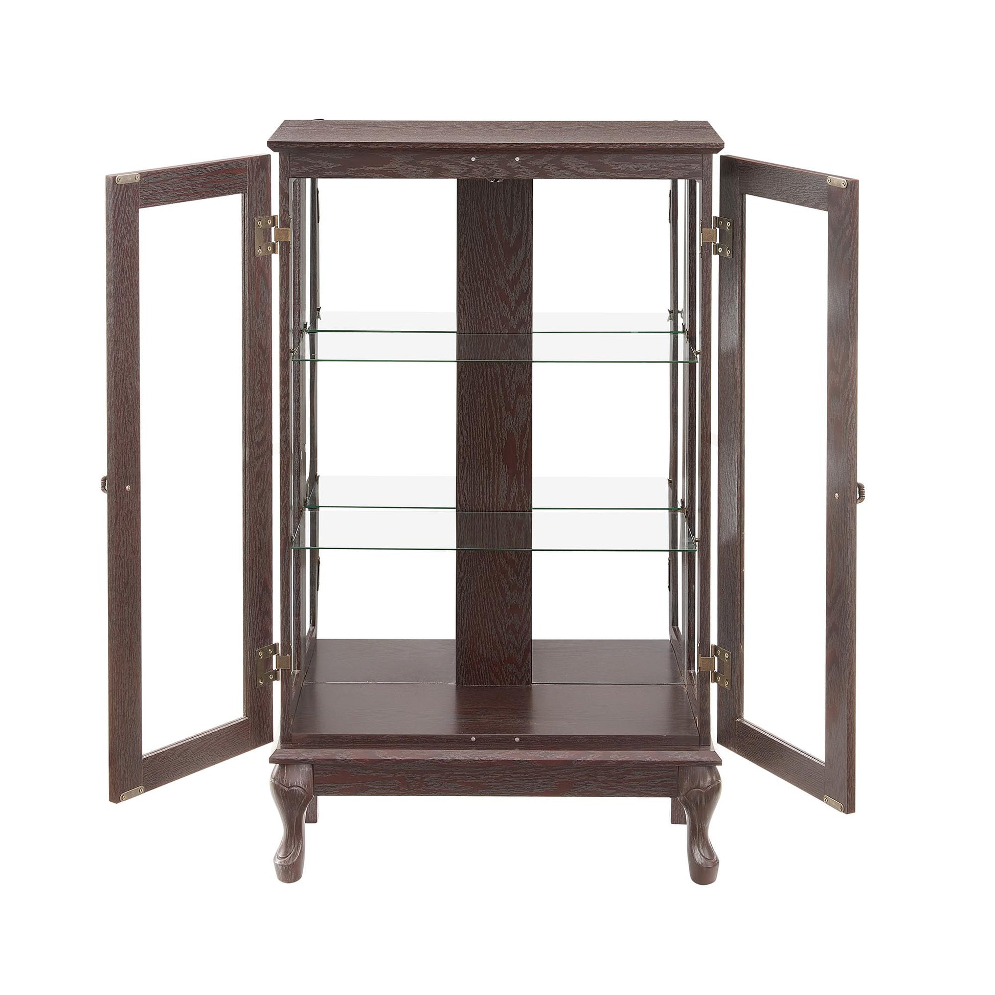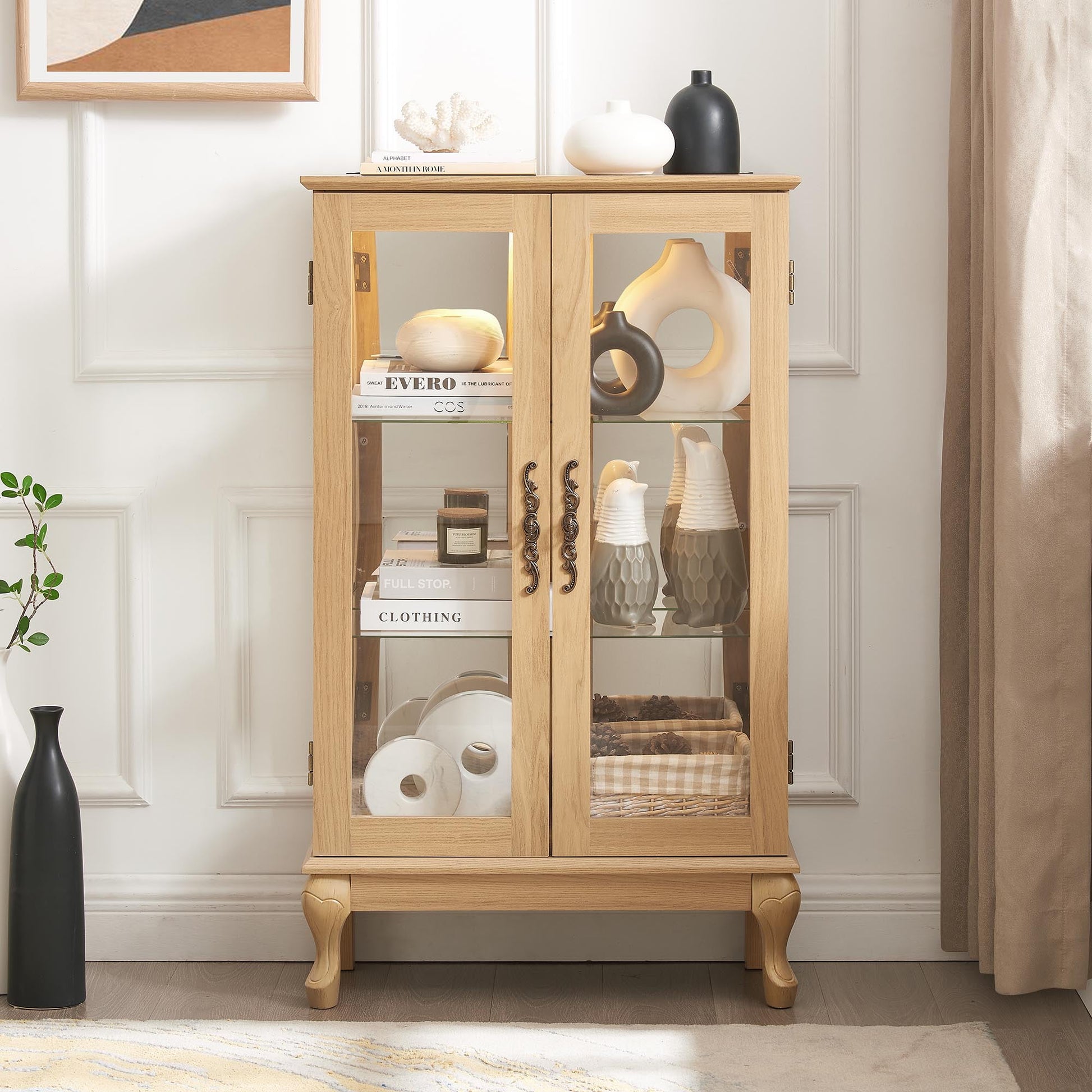 This Curio Cabinet is intricately designed with curved legs and metal handles, embodying classical beauty and vintage charm. Its timeless retro style seamlessly integrates into any corner, radiating an everlasting sense of sophistication.