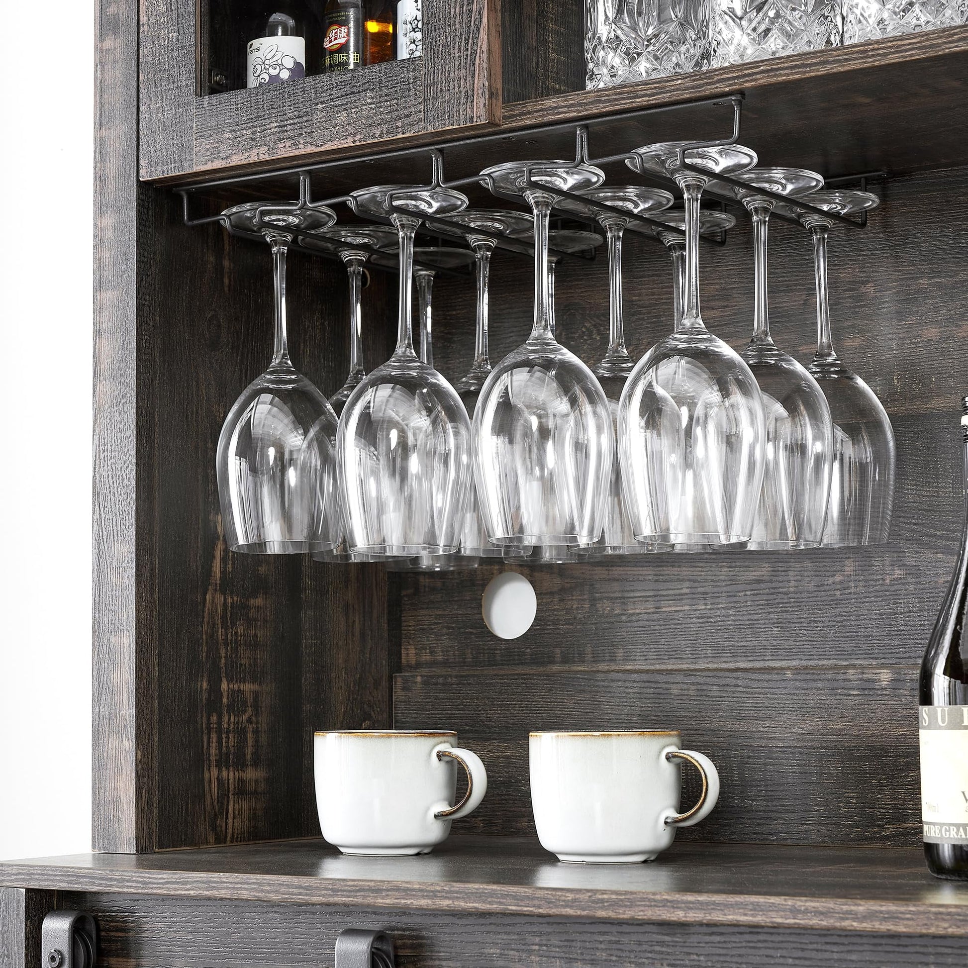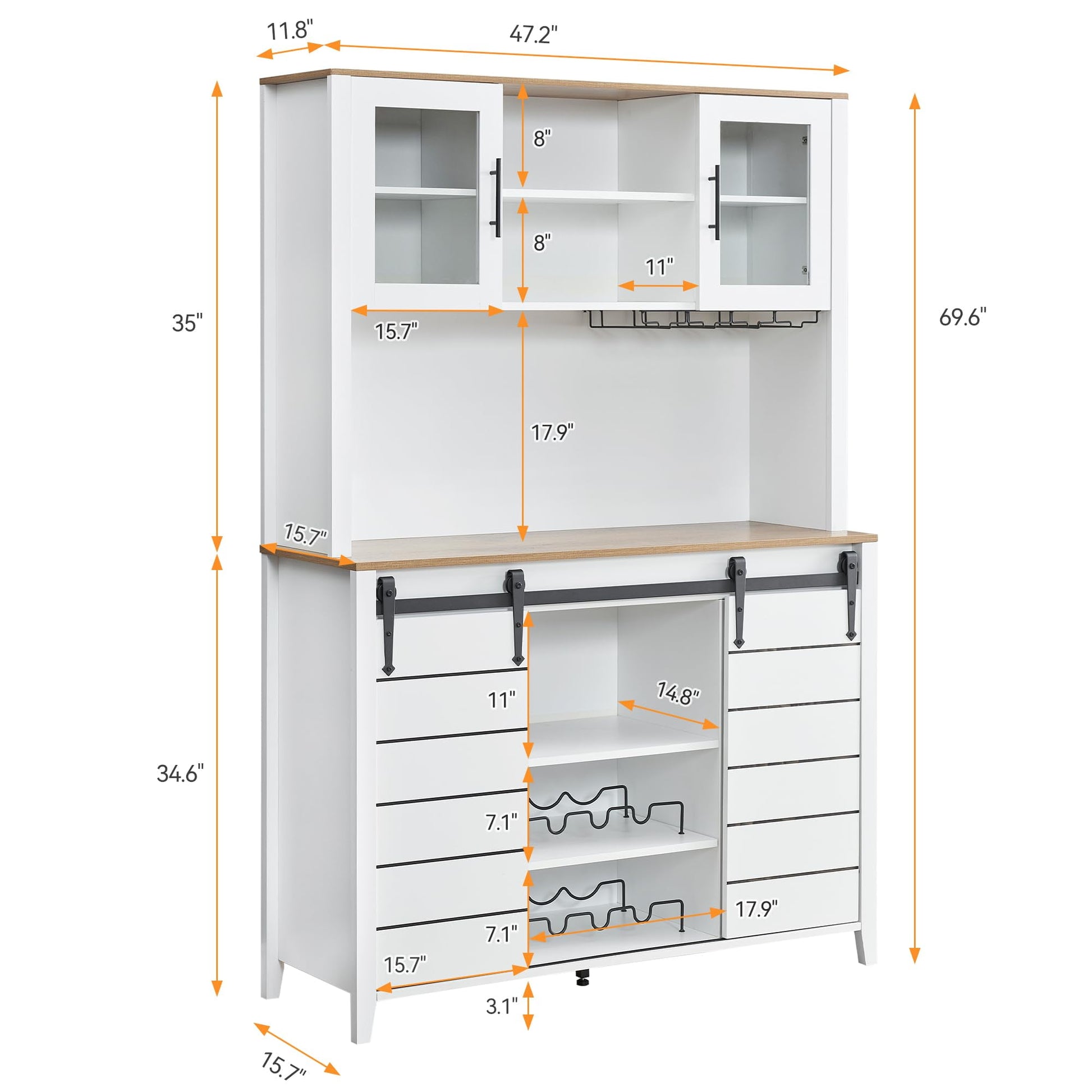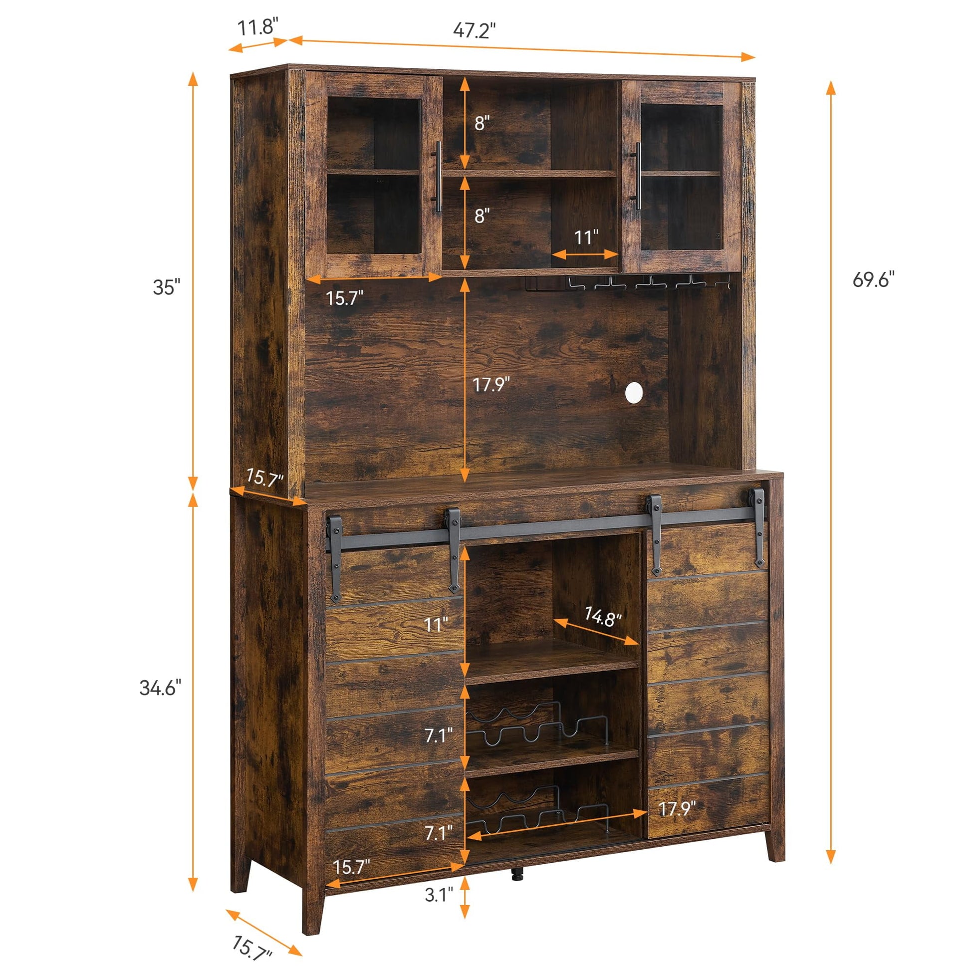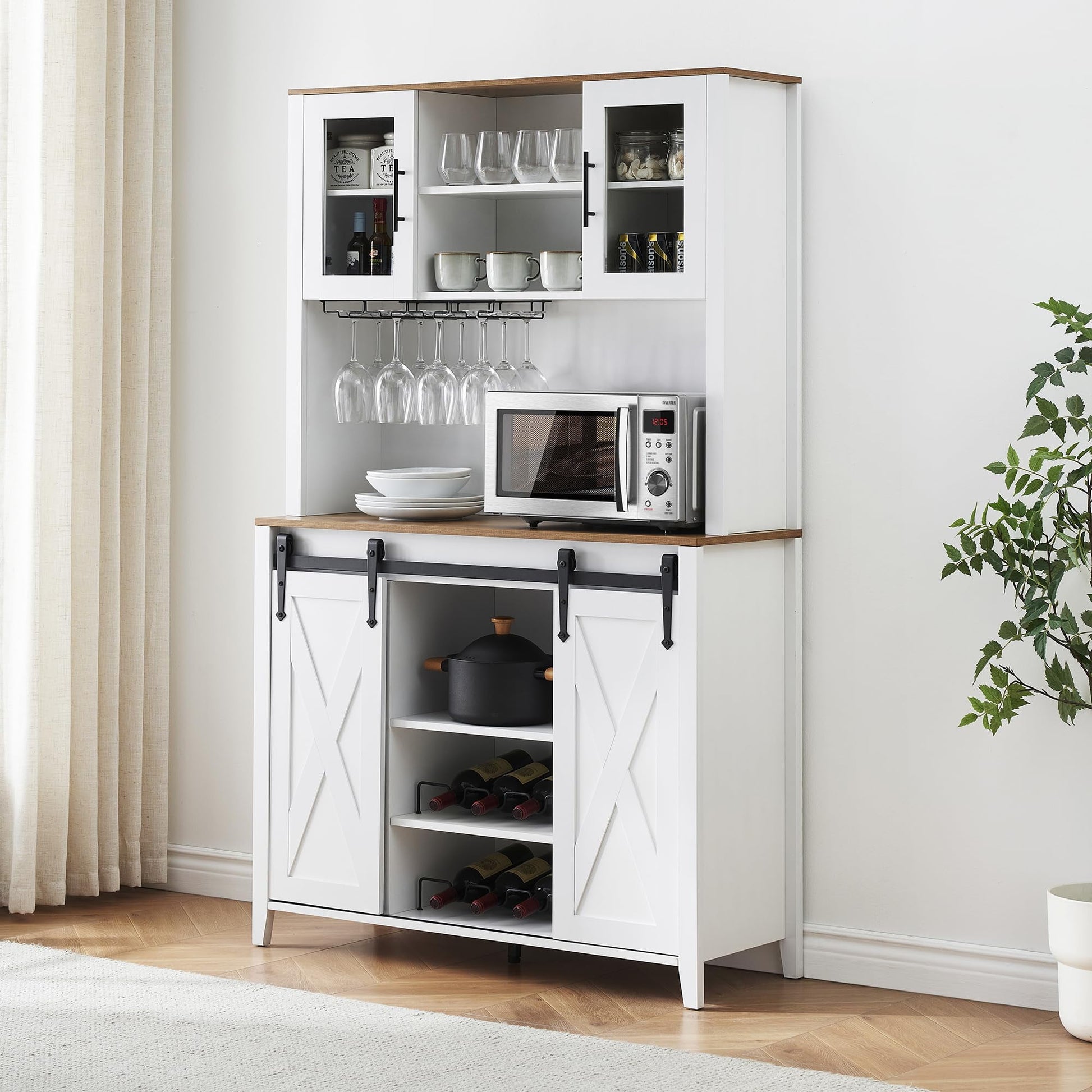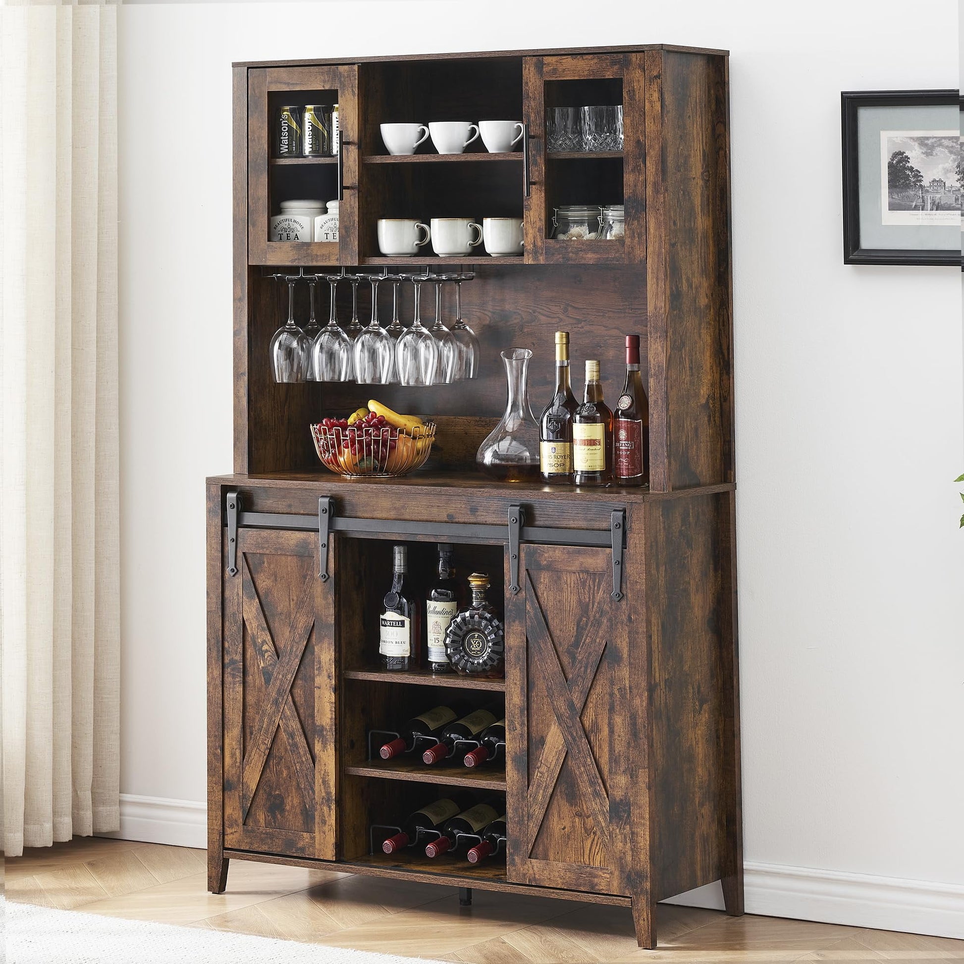 2024 New Farmhouse Coffee Bar Cabinet with Sliding Barn Door, 72in Tall Buffet Cabinet with Storage Shelves, Liquor Cabinet with Wine and Glasses Rack,Sideboard Cupboard for Kitchen,Dining Room
