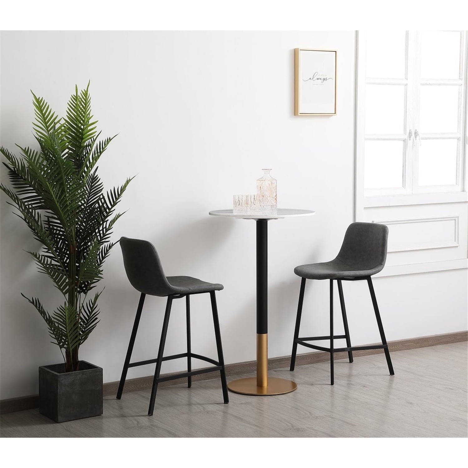 The Ronan pub table makes a nice addition to your home. This pub table provides additional dining space in your kitchen. Features a matte brass base that is accented with black metal stand and a faux marble top. The table top is 23.5 inch wide making it big enough for two but still small enough to use the space economically.