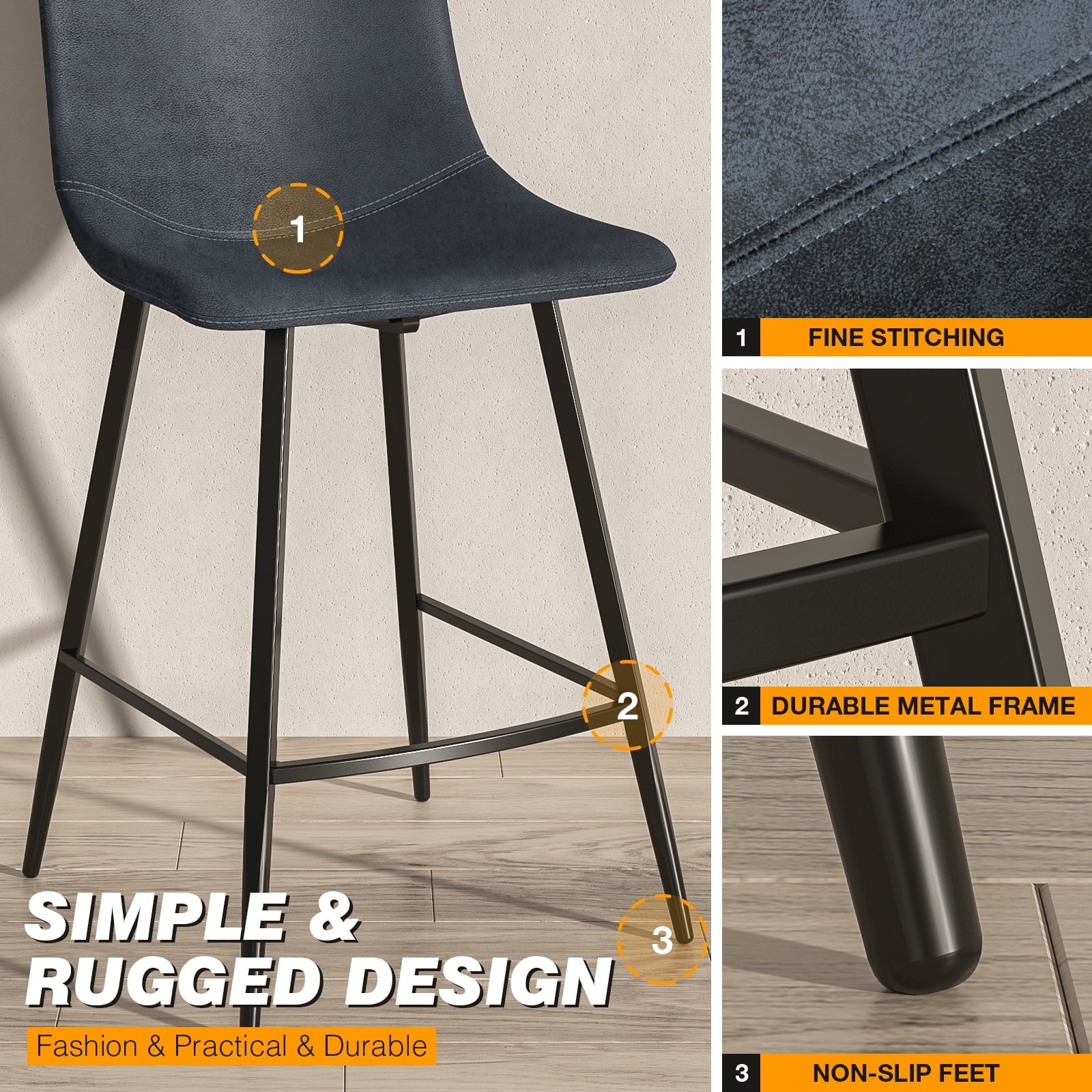 - -brown powder-coated steel legs with non-slip and anti-scratch protecter design to prevent the barstool chairs from overturning on the side and prevent floor from scratching.