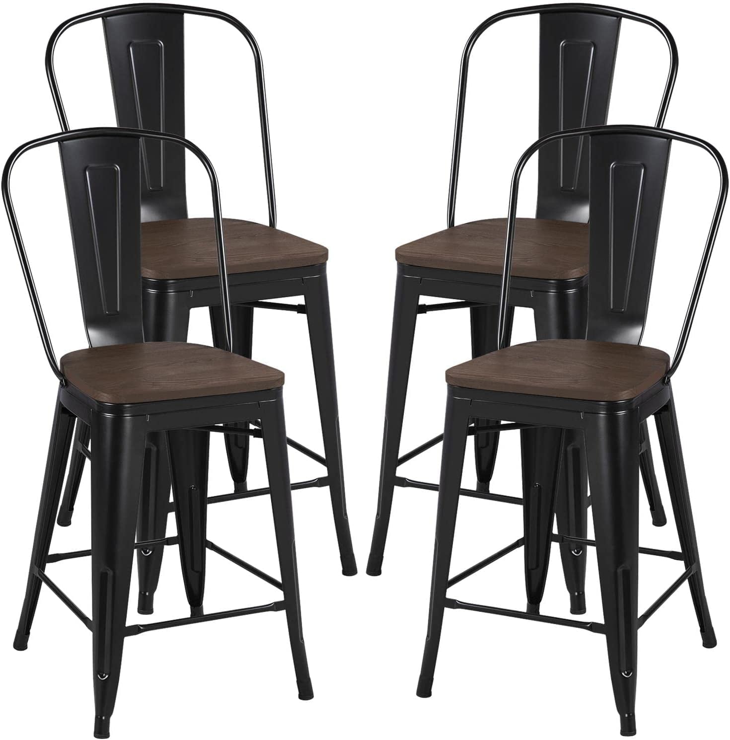 24Inch Seat Height Dining Stools Chairs with Wood Seat/Top and High Backrest, Industrial Metal Counter Height Stool, Modern Kitchen Dining Bar Chairs Rustic, Black, Set of 4