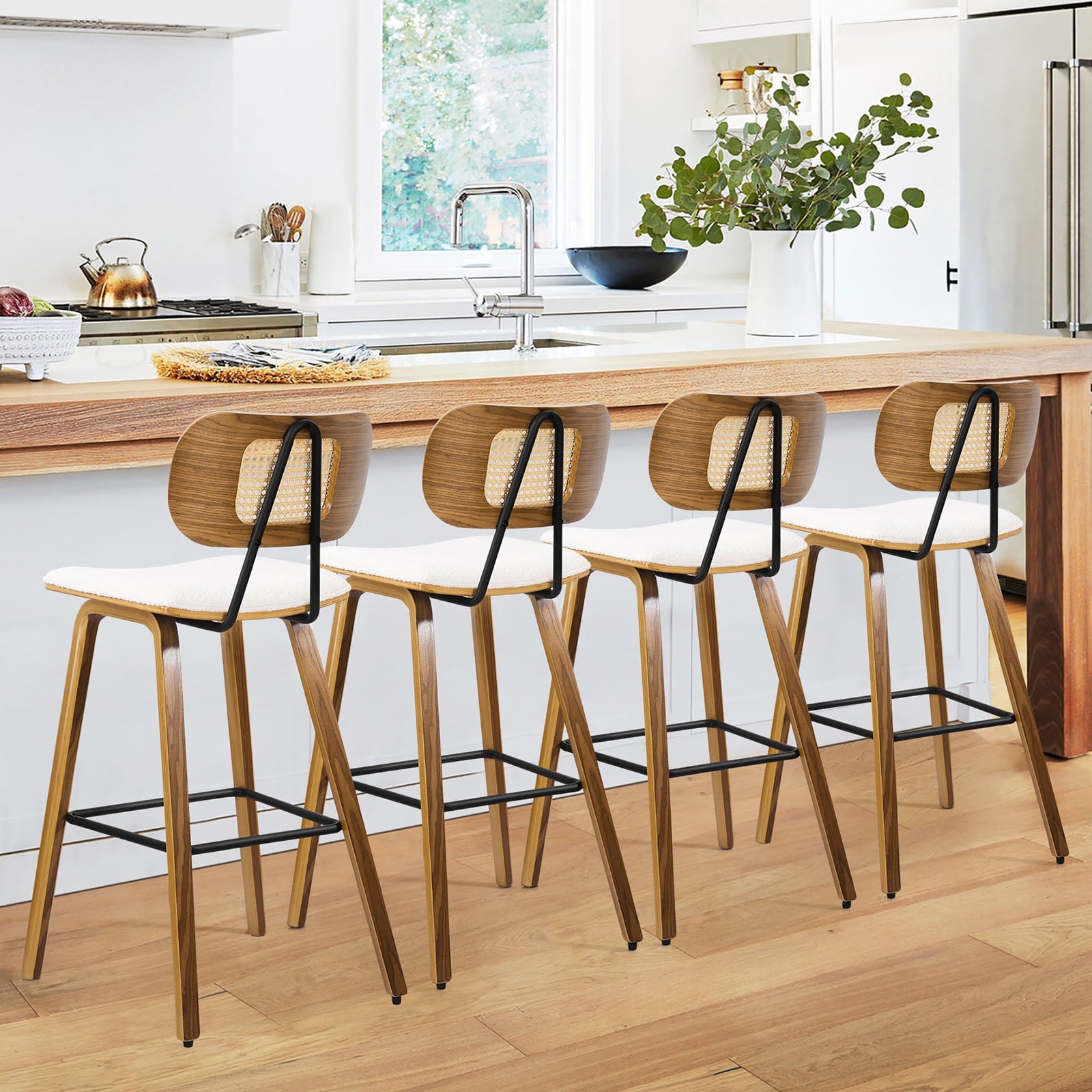 26in Counter Height Bar Stools with Rattan Back Set of 4, Mid Century Modern Wooden Stool Boucle Fabric Upholstered Bar Chair for Kitchen Island Dining Room