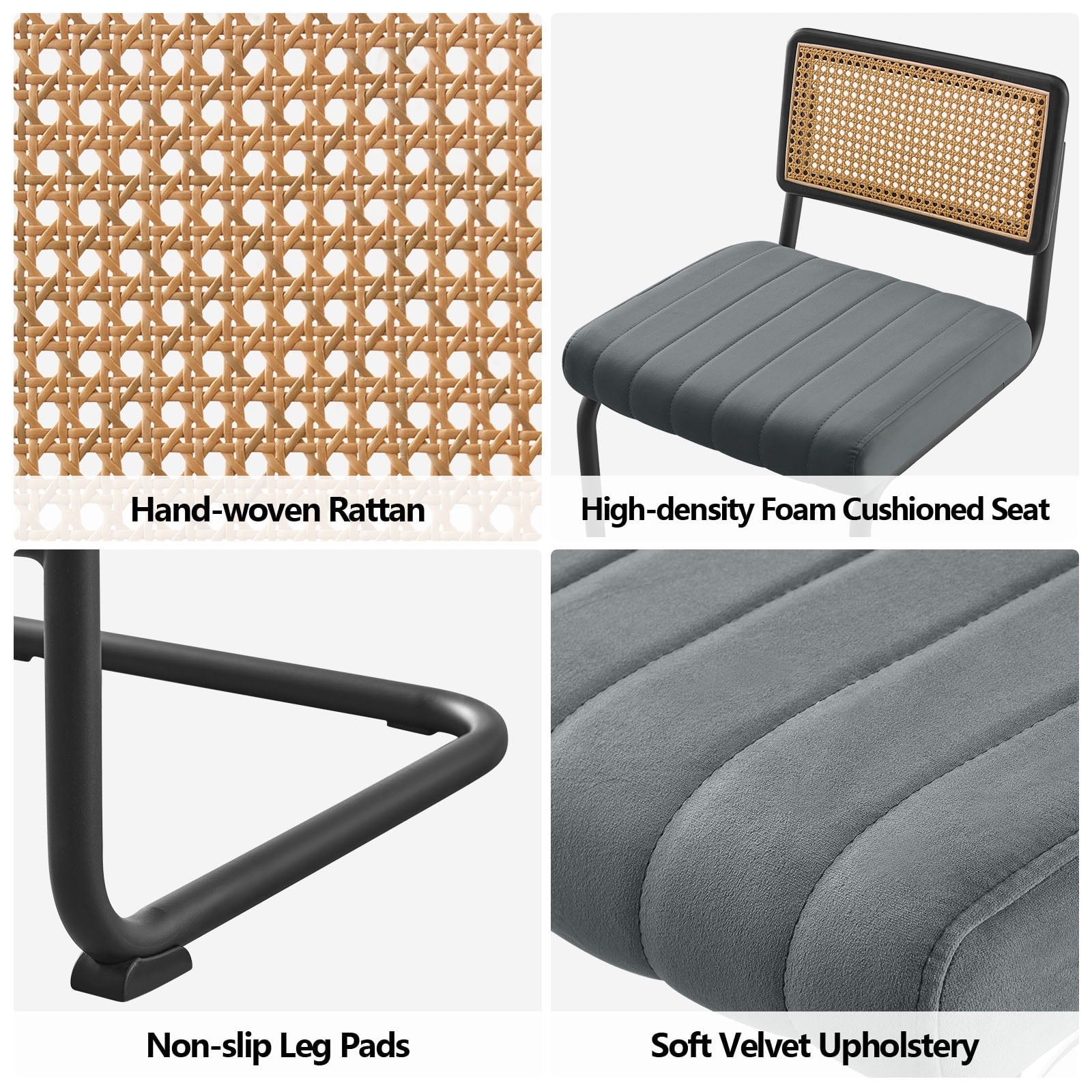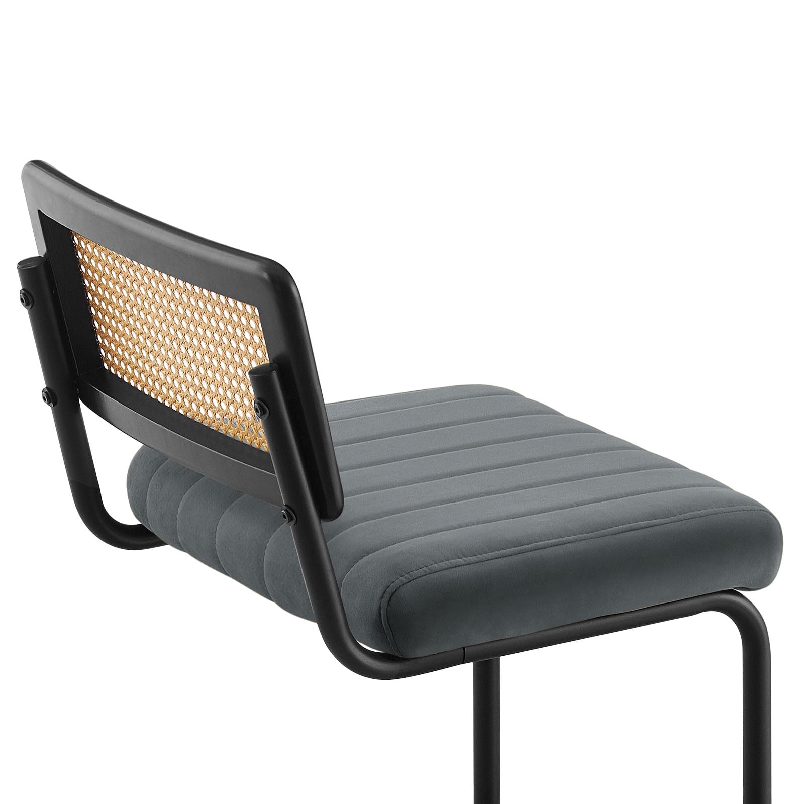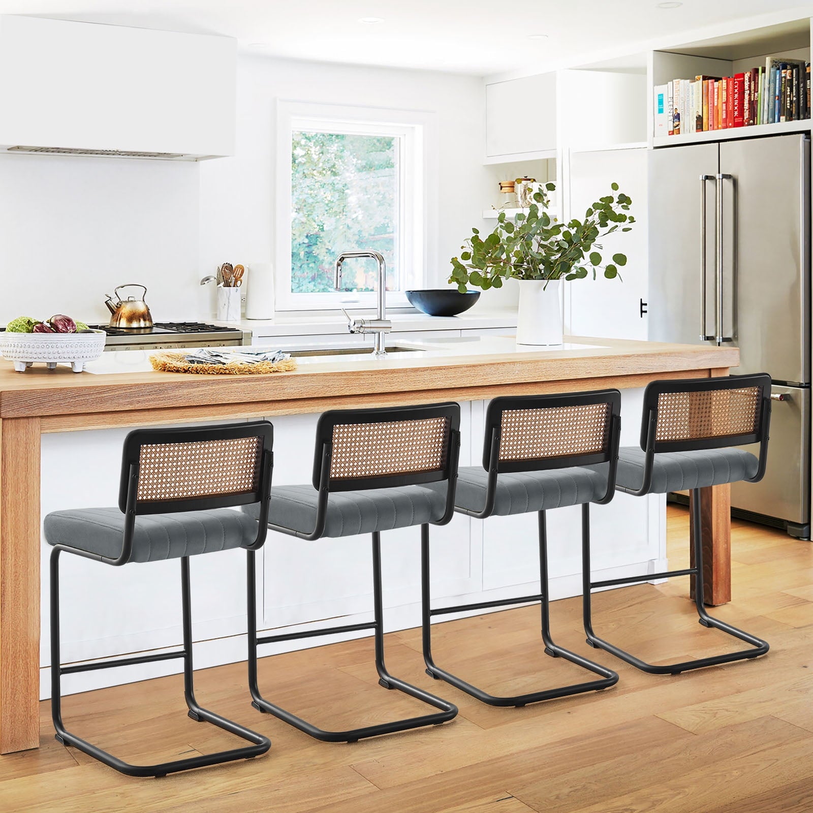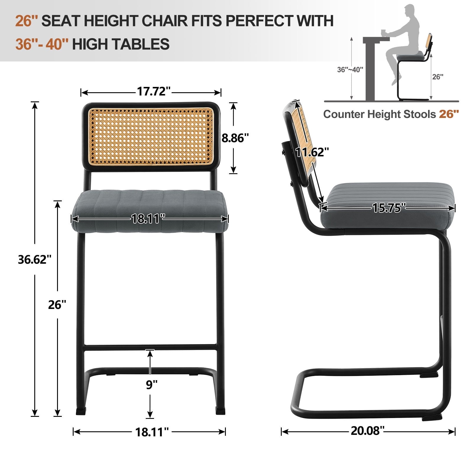 26in Rattan Counter Height Bar Stools, Set of 2, Velvet Armless Bar Stools with Cane Back Mid Century Modern Chair for Home Office Kitchen Island