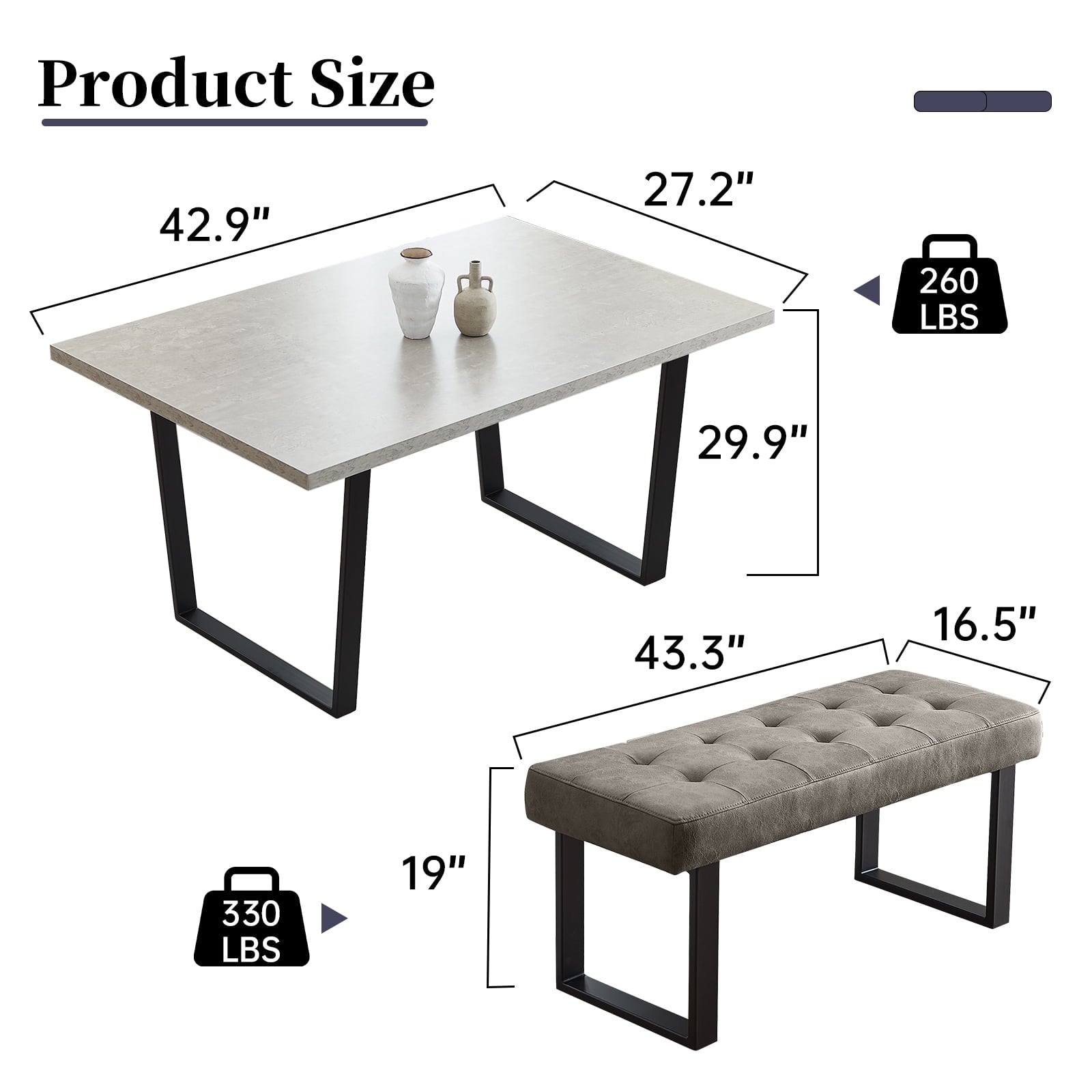 - [3 Piece Set Design] This dining room table set includes 1 table, 1 right seat sofa bench and 1 bench 43.3 inch. Ideal for your kitchen and dining room, the dining bench fit right up under the table when not in use, providing a large dining space and comfortable dining experience for either friends or family. [High Quality Table] Modern gray dining table is made of MDF material, sturdy and durable. The U-shaped metal legs have strong support, making the table as a strong and reliable option for long time.