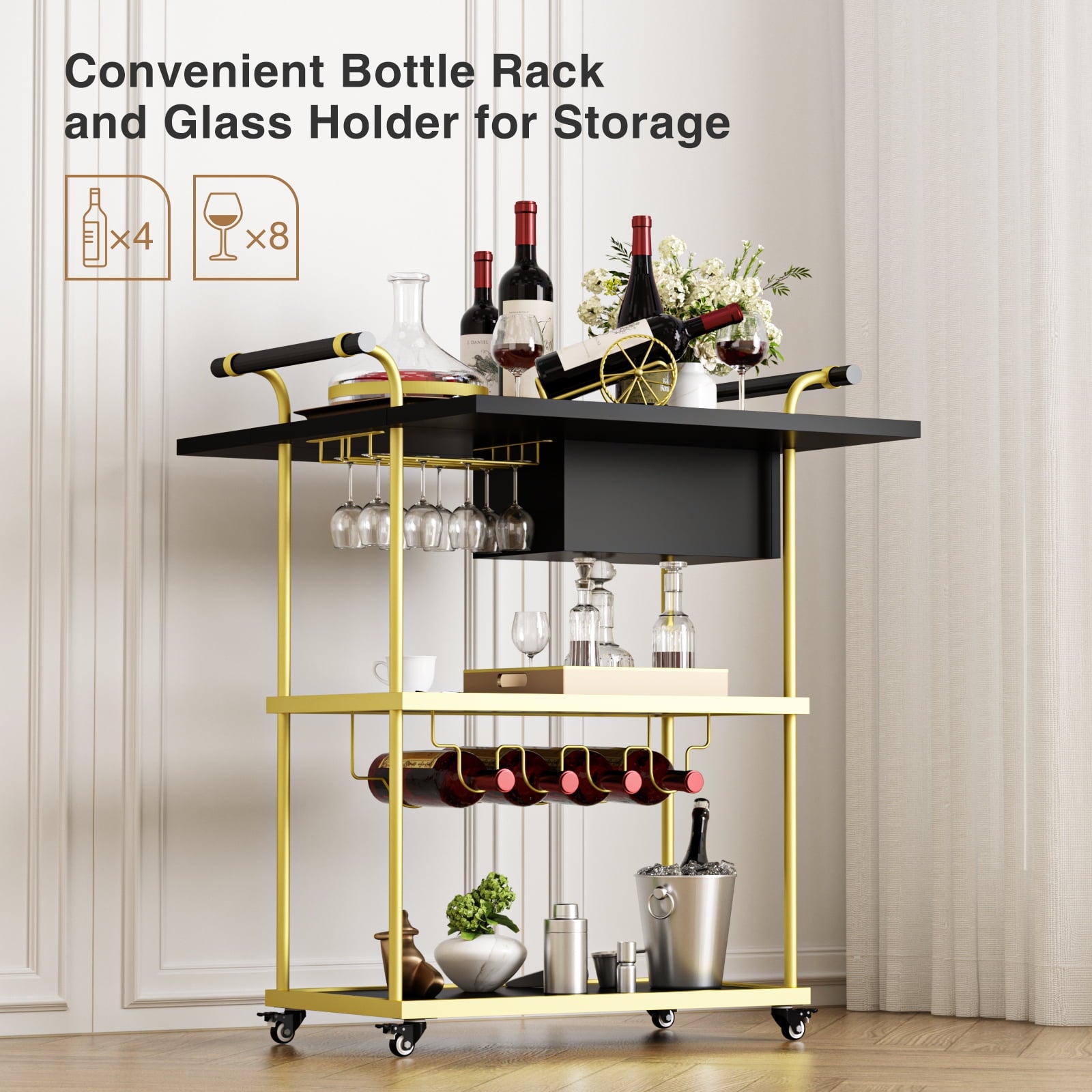 - This kitchen carts on wheels with storage. With spacious storage drawer for your fine wines, tableware, and assorted items, two rows of wine glass holders for 6-8 glasses, and a special wine rack for bottles that holds 4 bottles securely, your favorite whiskey, gin, rum, and other beverages are neatly arranged and elegantly displayed on this trolley. This rolling cart can be used for your own enjoyment as well as for parties with friends.