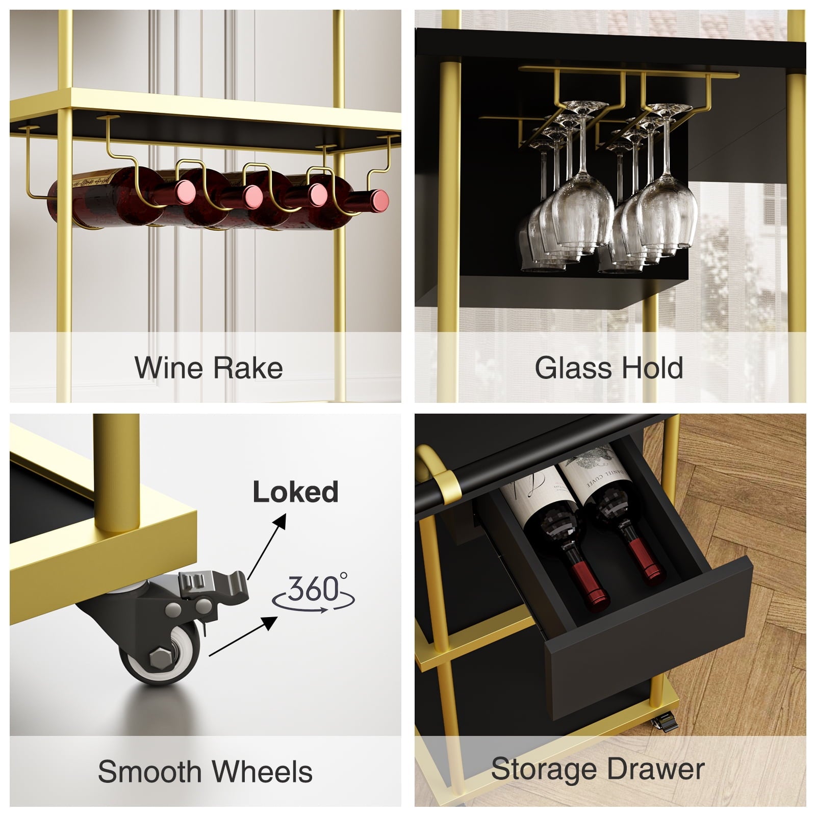 - This gold bar cart with wheels is designed with practicality and convenience in mind, it has four rubber silent casters that can swivel 360??, making it both safe and silent to move around without disturbing your family or friends.This wine cart Allows you to easily roll it to wherever you need it for the party.Two of the casters with brakes ensure a safe stop and avoid accidental sliding, making your party perfect.