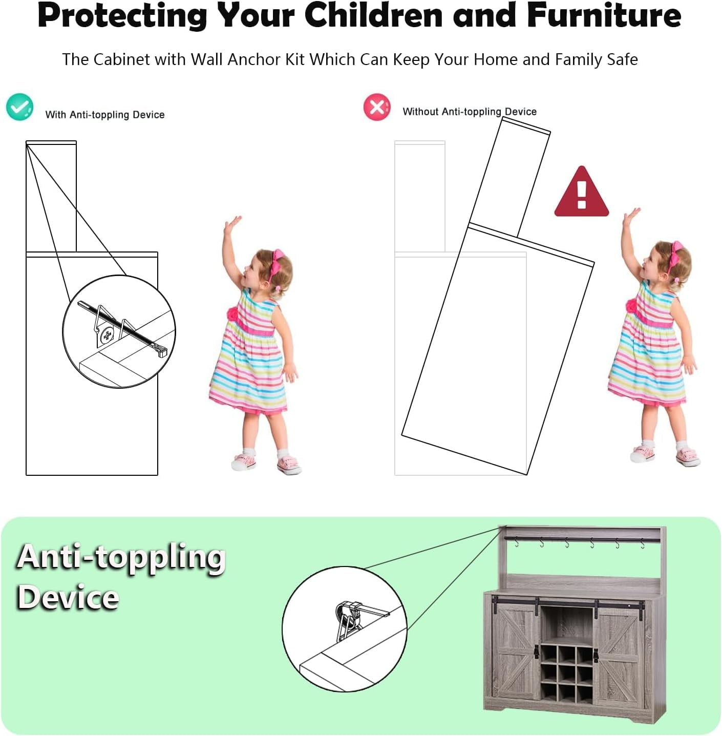 Elevate your living space with SNYNUXX Sideboard Cabinet. Crafted in a rustic farmhouse style, it features a washed gray finish and sliding barn doors that create a striking contrast. With 6 hooks and 9 wine racks, this sturdy cabinet offers ample storage for your coffee, wine, and dining essentials. Crafted from high-quality P2 particle board with an upgraded base and anti-tip mechanism, it can be used as a coffee bar, sideboard buffet, or console table, seamlessly blending function and style. Easy to assemble, this cabinet is a must-have for any modern farmhouse or transitional decor.