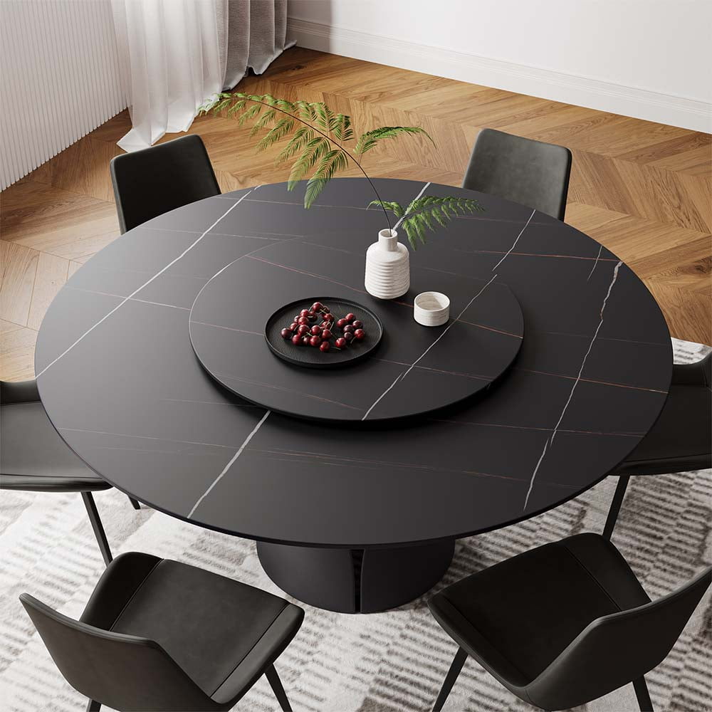 POVISON 59in Modern Round Black Kitchen Dining Table For 6 With Lazy Susan, Matte Sintered Stone Tabletop, Solid Black Carbon Steel Base
