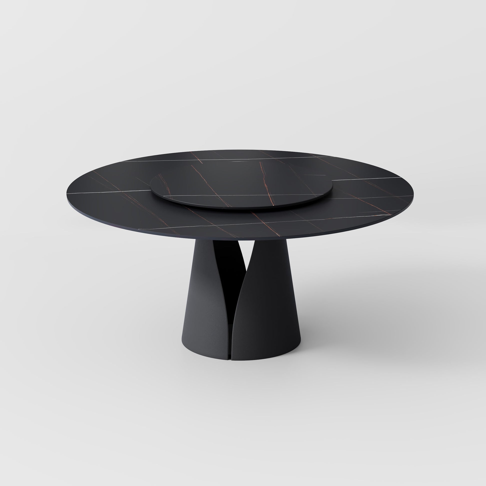 crafted from A3 class carbon steel with a sintered stone tabletop, this circular table accommodates from six to eight people in style. A tapered pedestal with hollow out design gives this table just a hint of mid-century appeal.