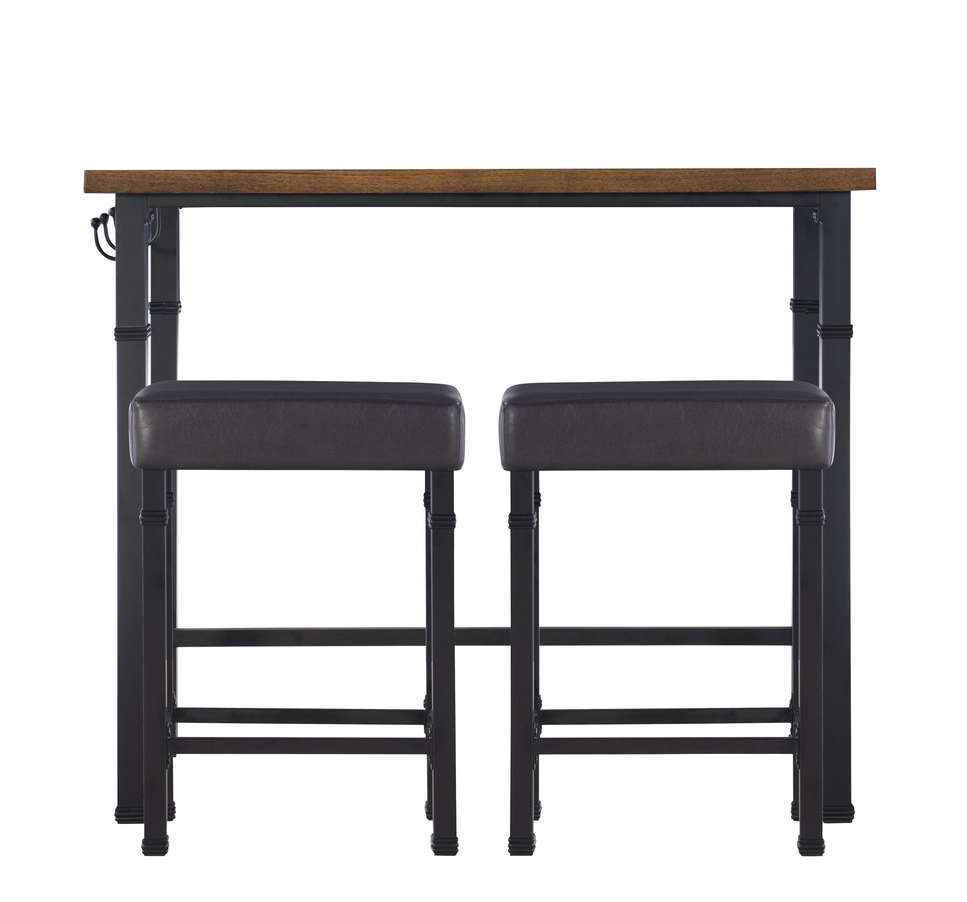 Rustic and industrial in style and design, the Austin Three Piece Pub Set is perfect for small dining rooms and kitchen breakfast nooks. Crafted from metal, the base of the table features a black finish and decorative metal trim accents. Two brown PU upholstered stools, easily tuck beneath the table when not in use. The wood planked top has a rich brown finish. Three hooks are perfect for hanging linens and towels. Stool weight limit is 275 lbs.