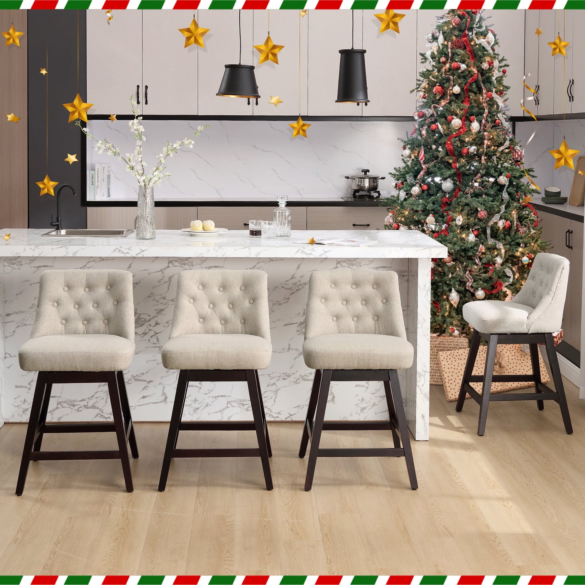 Our bar stools swivel with the back by the kitchen bar to decorate your home. Linen barstools feature an ergonomic back and padded seat, plus a swivel design which makes them practical and comfortable. Support slats provide a comfortable footrest while seated. It is an ideal solution when you have guests over for drinks or dinner. Our stools are available in counter height stools and bar height stools, and in 3 durable colors, gray, blue, and beige. This modern dining bar stool supports up to 330 lbs and is complete with non-marking foot caps to protect your flooring. The assembly is simple in less than 25 minutes. Our swivel counter stool sets don't disappoint you. TEWLOSS Swivel Counter Height Bar Stools Set of 4 Linen Fabric Barstools for Kitchen Island (26\
