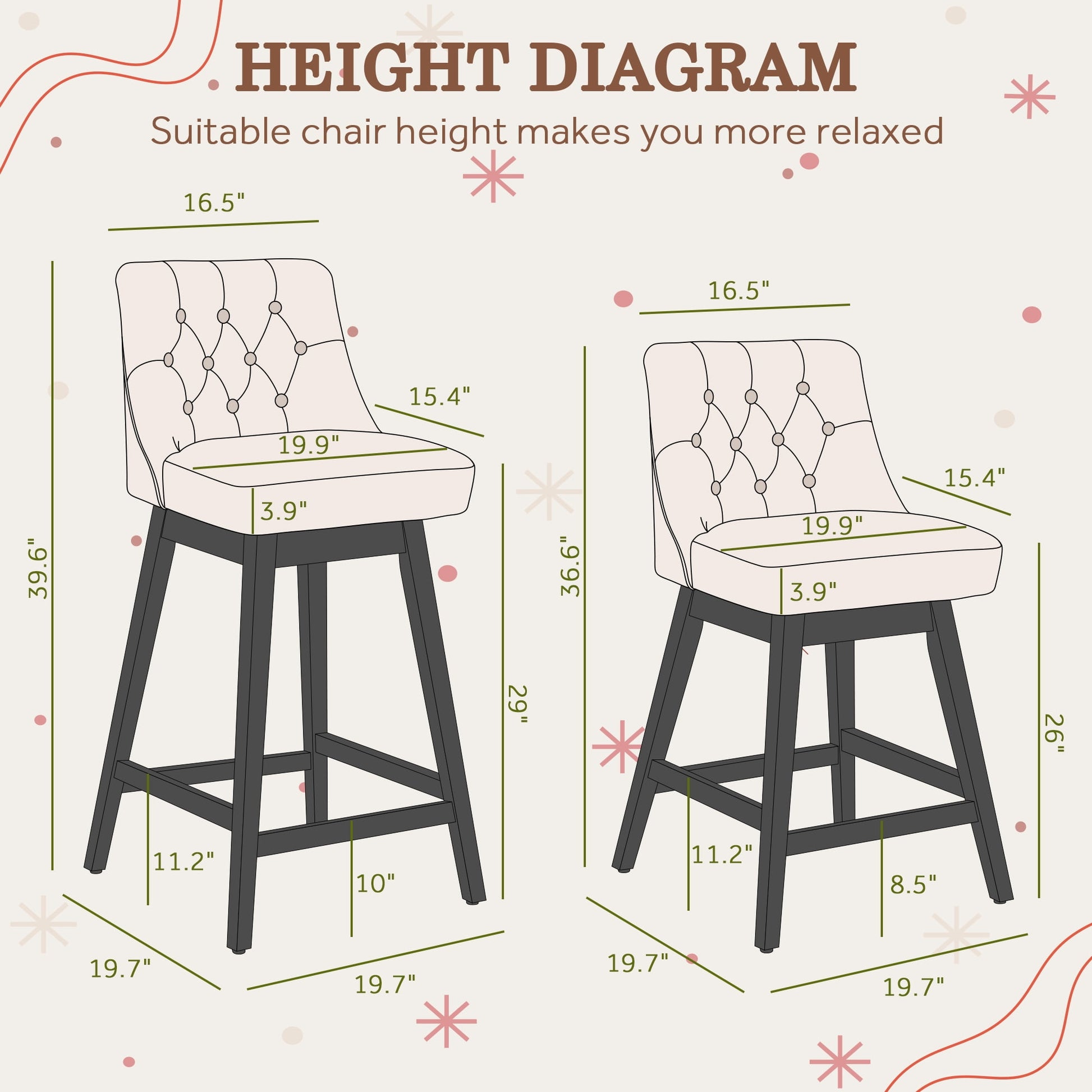 Suitable for Various Occasions: With simple buttons these bar chairs add a stylish and elegant look to any room. Stools for kitchen counter also can be perfectly matched with various decorative styles, and you can put them in your kitchen, living room, bar, or restaurant.
