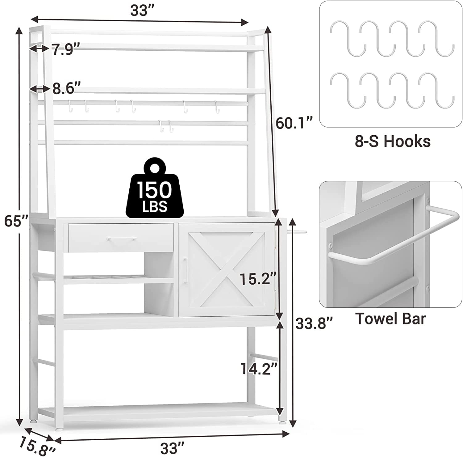 - A baker's rack with a drawer, wine rack, tower rack, 8 S hooks and open storage shelves.