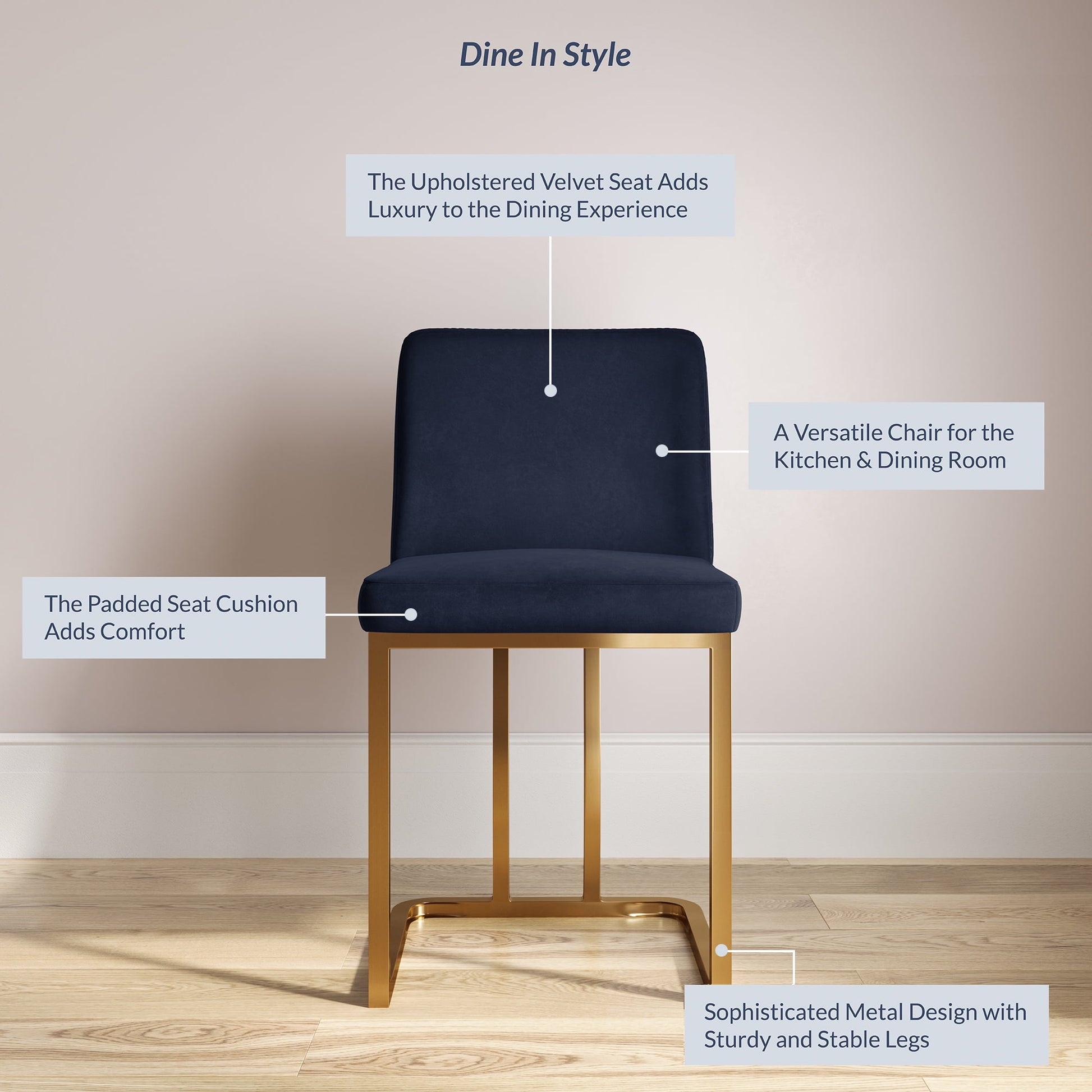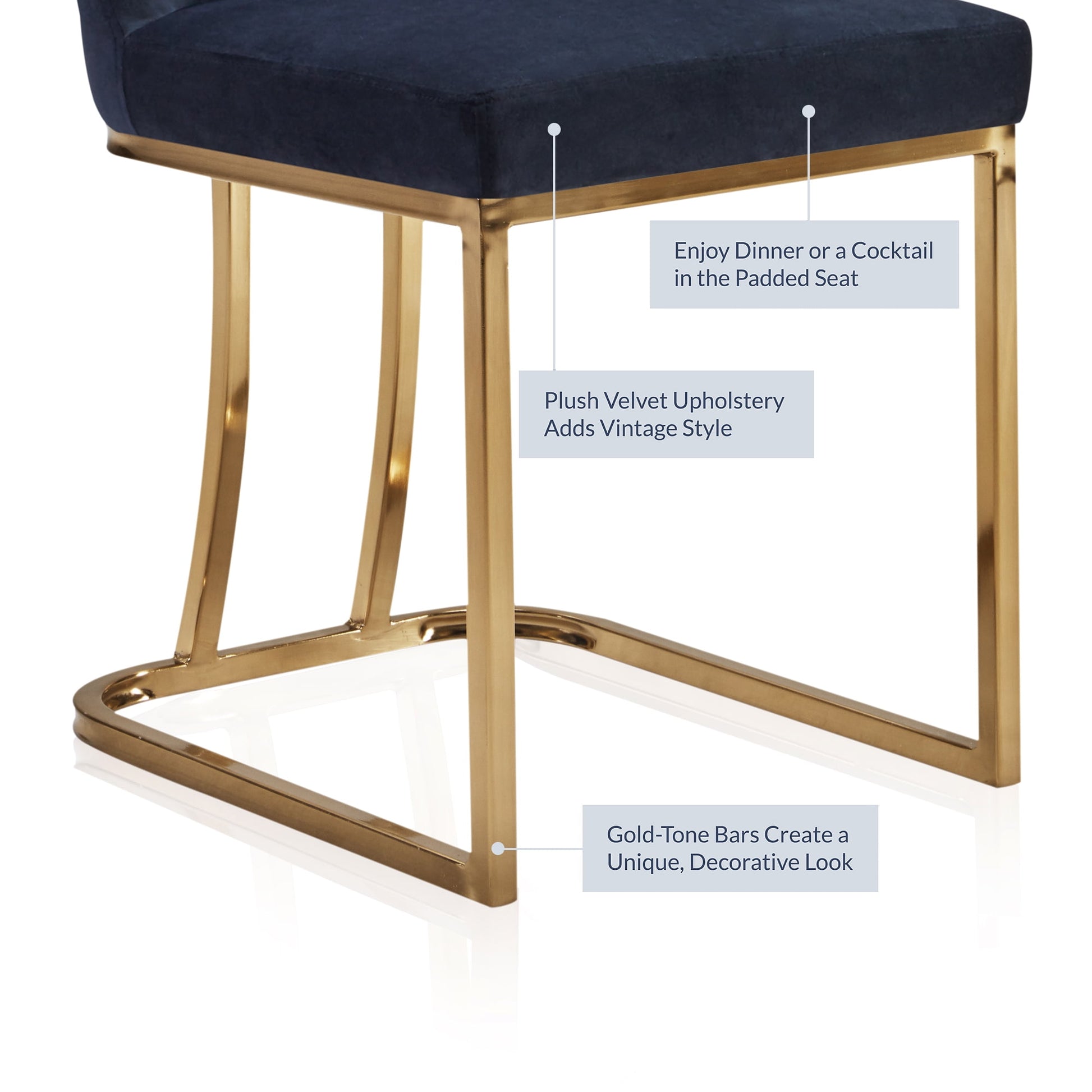 Upholstered in soft and supple velvet, the ergonomic seat is also padded with high-density molded foam that resists becoming deformed. At the foundation, sturdy stainless steel base with shiny golden plating help retain a clean finish with anti-fingerprint technology. The frame provides excellent durability and stability with the sophisticated look of a Hutton dining chair in your kitchen, dining room, living room, or entertainment area.
