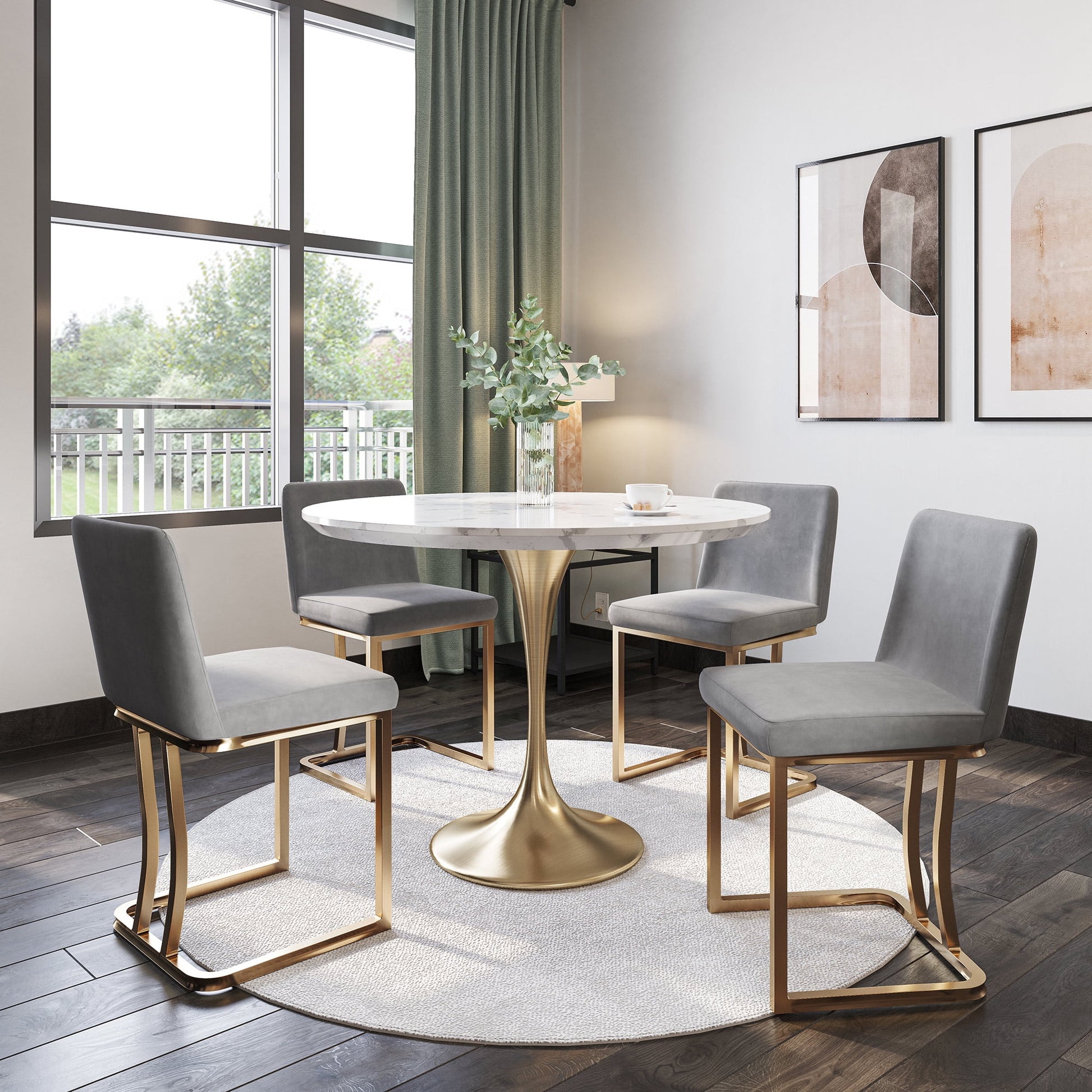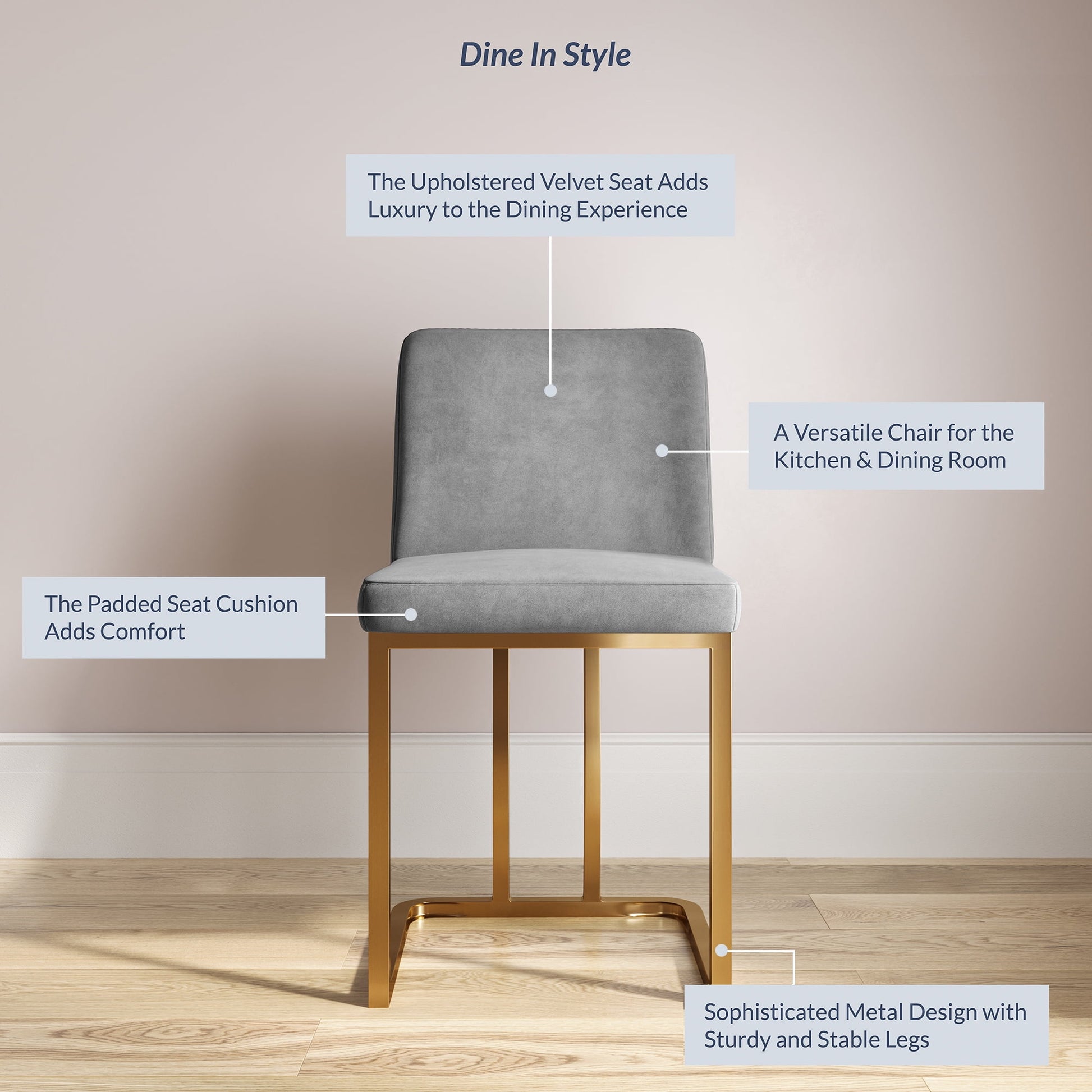 Upholstered in soft and supple velvet, the ergonomic seat is also padded with high-density molded foam that resists becoming deformed. At the foundation, sturdy stainless steel base with shiny golden plating help retain a clean finish with anti-fingerprint technology. The frame provides excellent durability and stability with the sophisticated look of a Hutton dining chair in your kitchen, dining room, living room, or entertainment area.