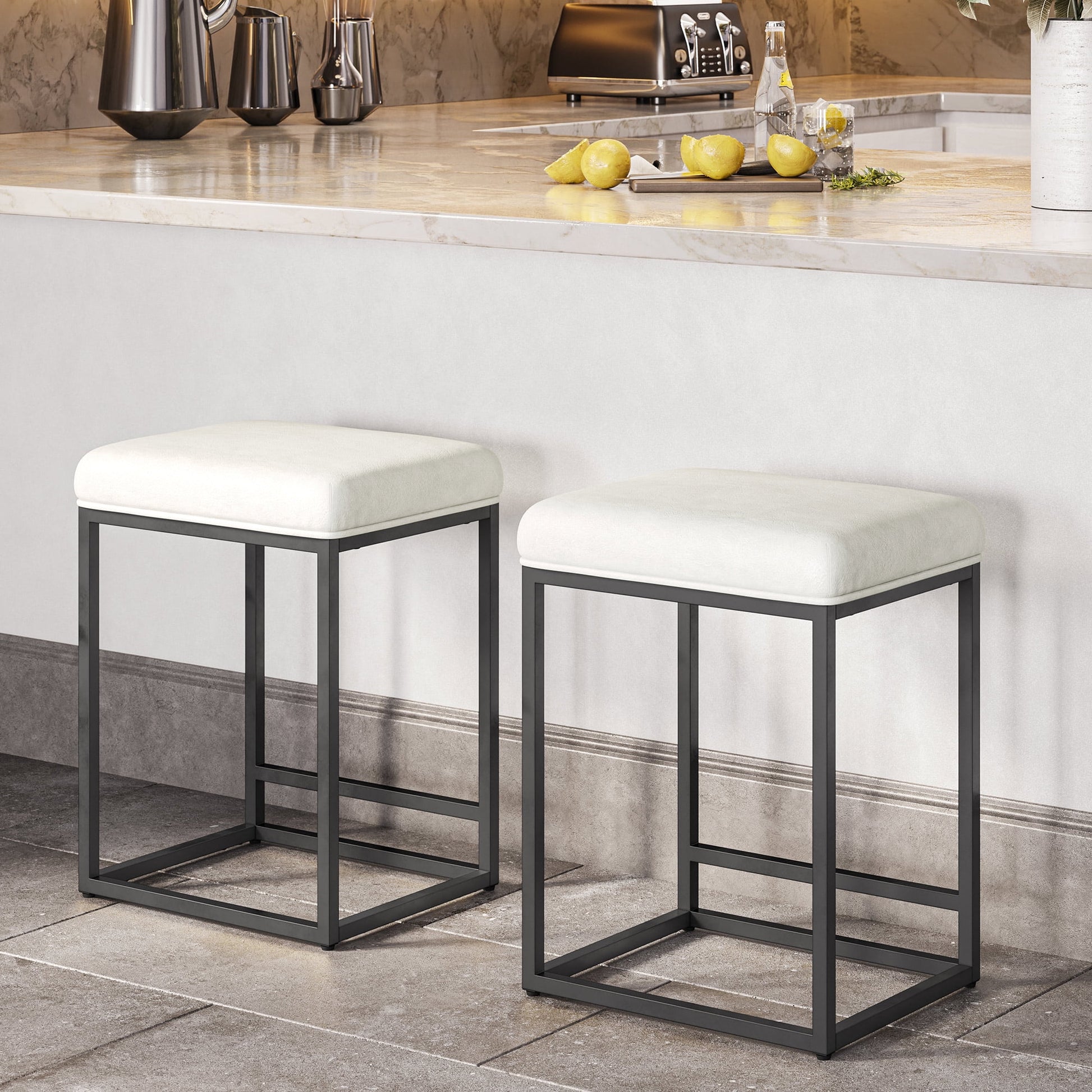 BELLEZE 24in Backless Bar Stools Set of 2, Counter Height Barstools, Modern Upholstered PU Leather Counter Stools with Metal Base Kitchen Island Chairs Dining Chair, White & Black