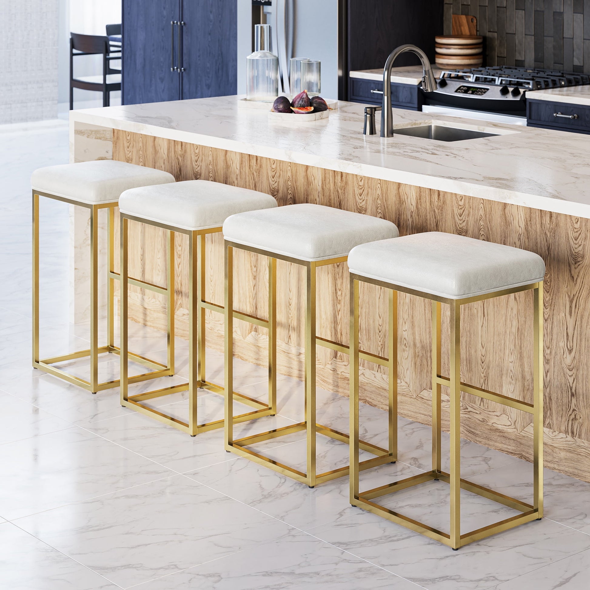 BELLEZE 30in Bar Height Bar Stools Set of 4, PU Leather Backless Barstools, Modern Upholstered Kitchen Stools with Metal Base Kitchen Island Chairs for Bar Pub Bistro, White & Gold
