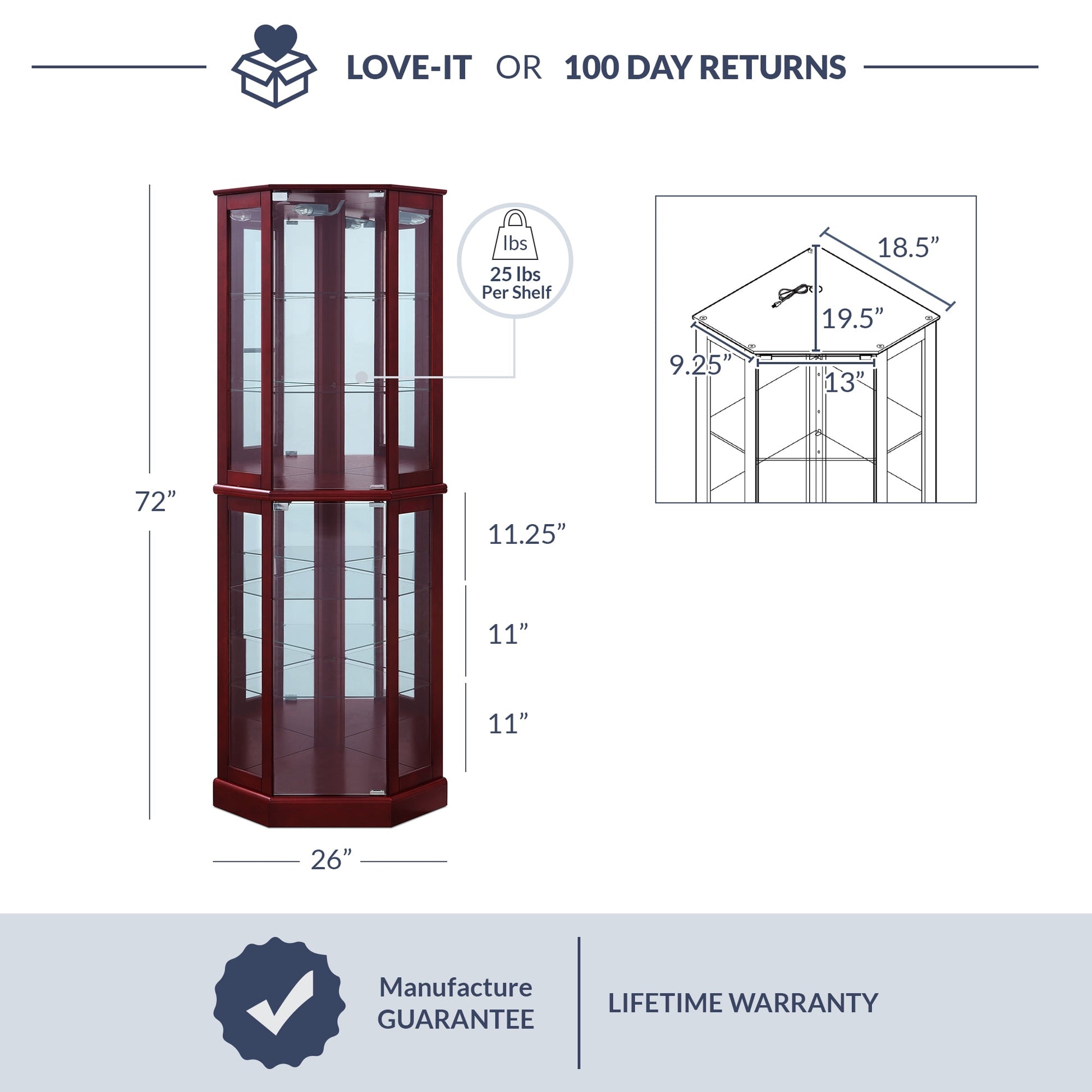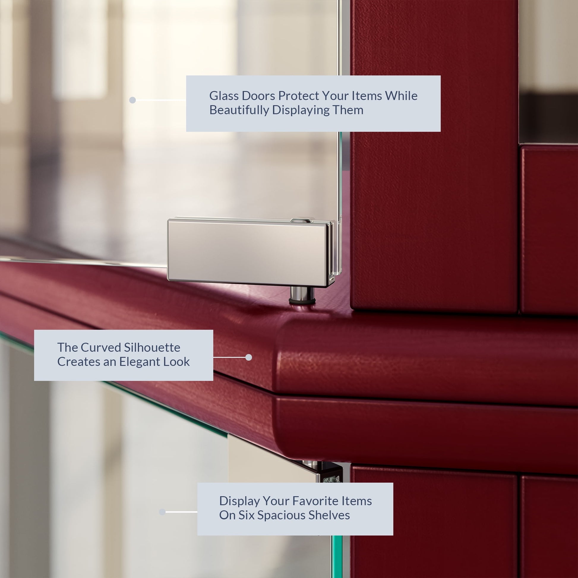 - Constructed from high-quality wood, the curio cabinet has a slim and space-saving shape that tucks securely into a corner.