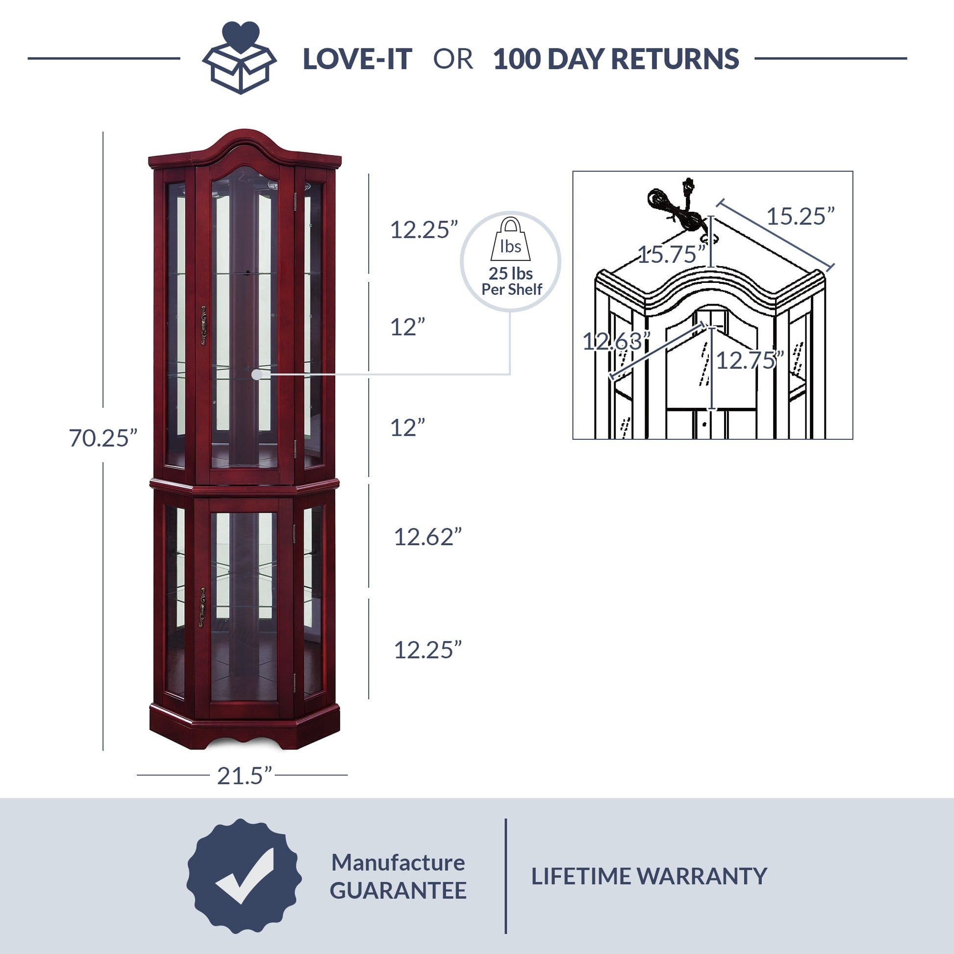- Constructed from high-quality wood, this top design corner curio cabinet has a slim and space-saving shape that tucks securely into a corner.