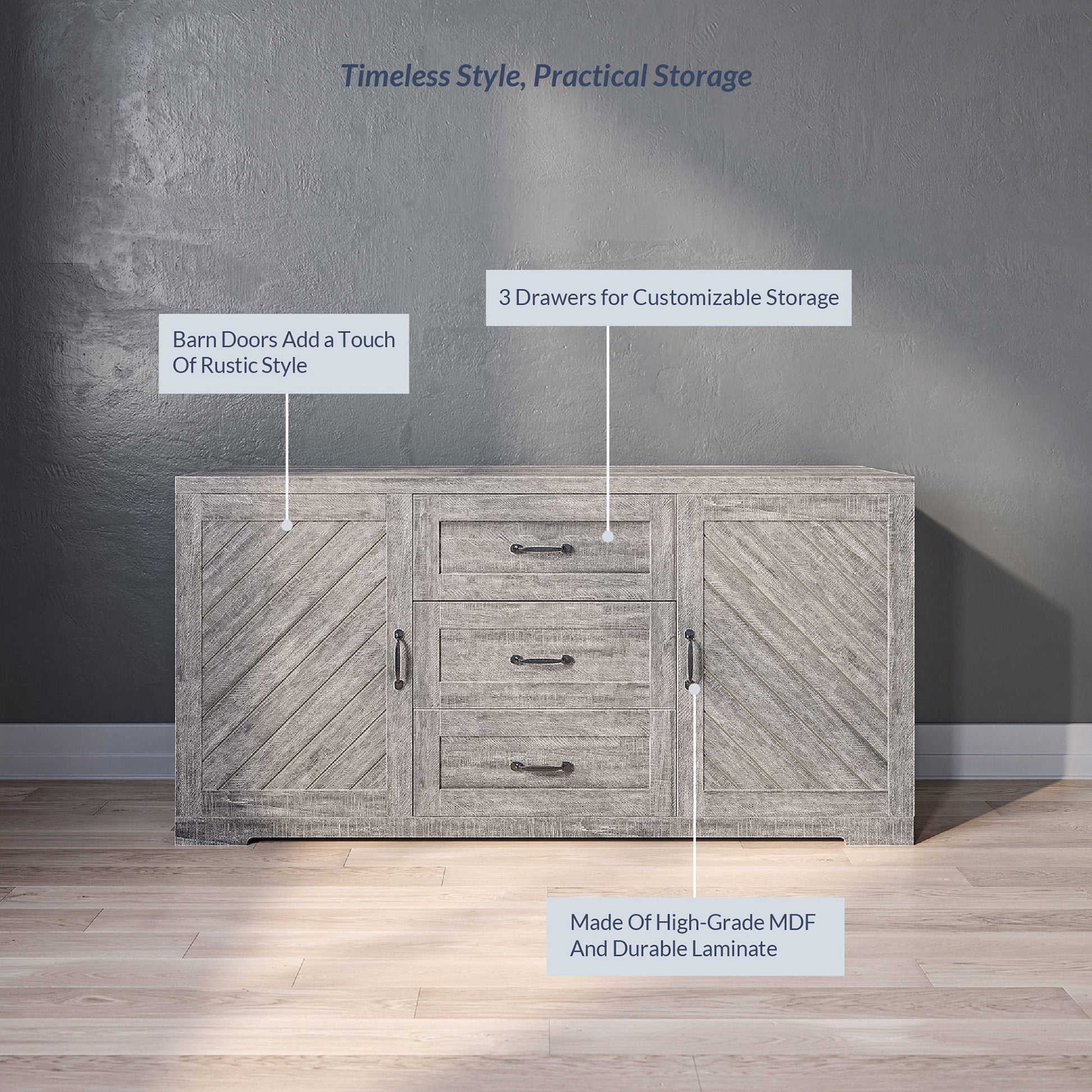 Channel modern farmhouse style in any room of the home with this versatile, sophisticated sideboard table. Whether you're seeking a place to put breakables in the dining room, create a home bar for the living room or wish to display precious heirlooms in your entryway, this console table will easily integrate into any setting.