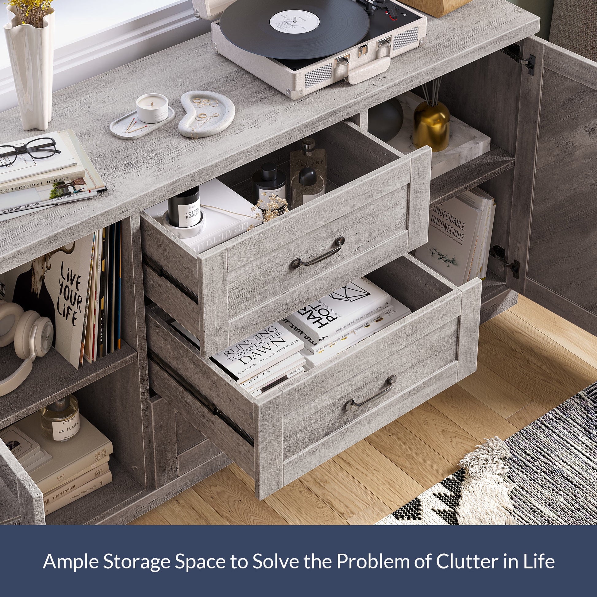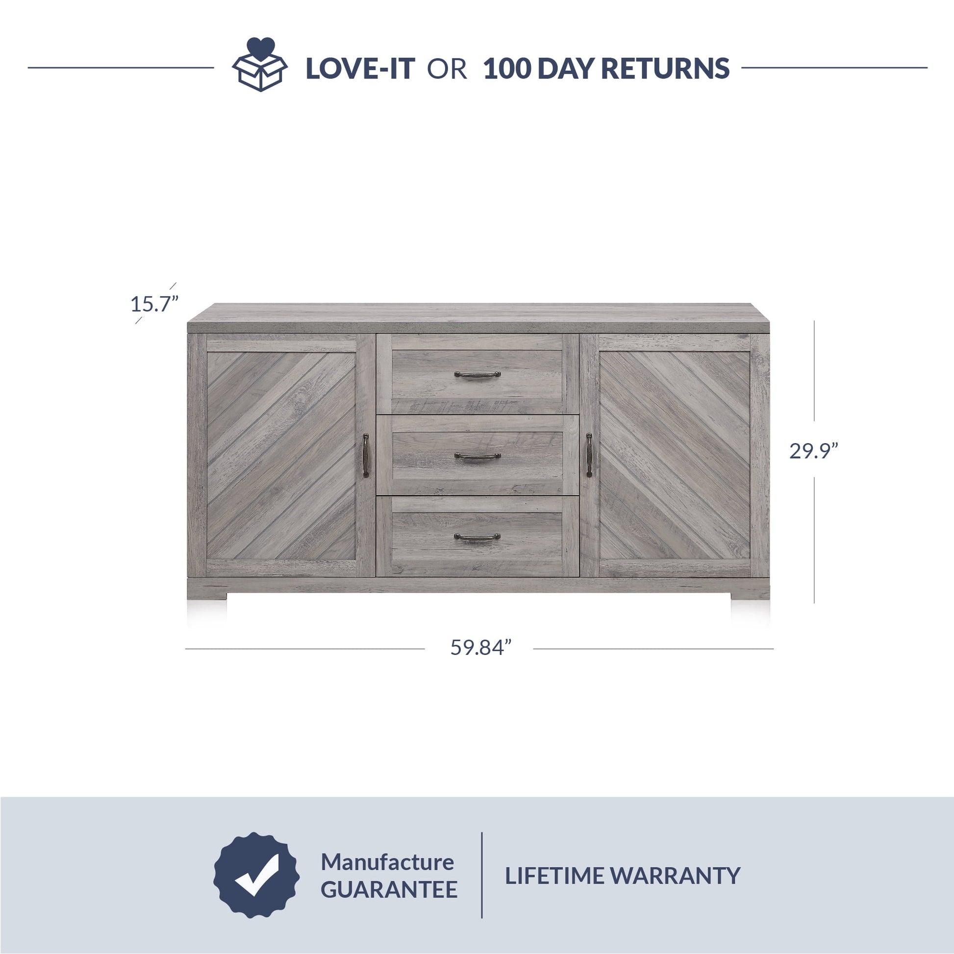 With built-in storage and adjustable shelves, this sideboard provides an ideal way to hide all of the clutter. Elegant diagonal panels accent the front doors. Behind the doors you'll find four convenient storage shelves, which provide a place to tuck away toys, books, blankets or other small items. You can easily adjust the shelves to suit your needs.