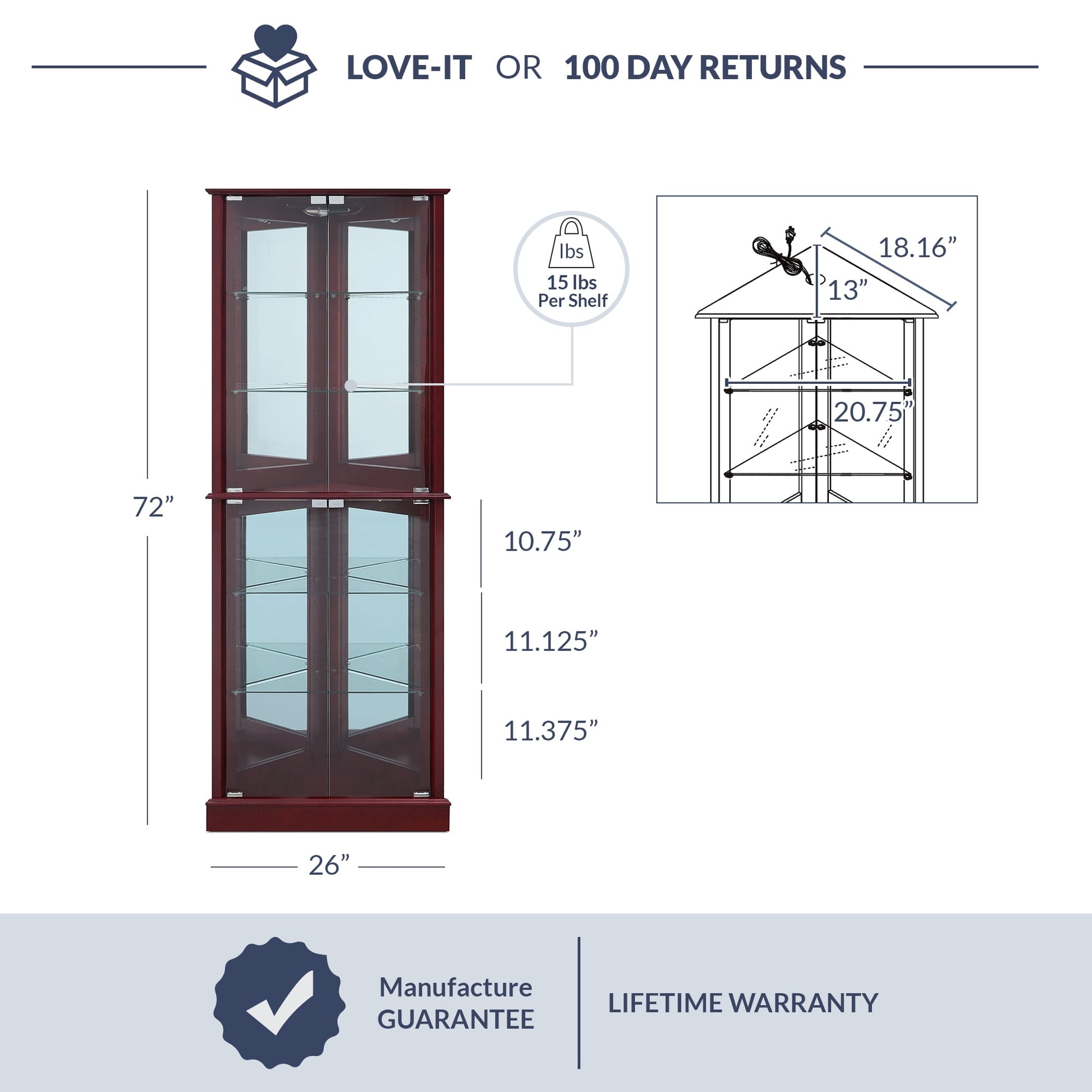 Showcase your favorite memorabilia, fine china, or decorative items all in one place in this classic accent, perfect for spaces that are tight. Crafted from wood with six shelves; this cabinet with glass doors enhances interior decor with traditional aesthetics. Add a touch of beautifully lit mirrored items with this corner shelf display.